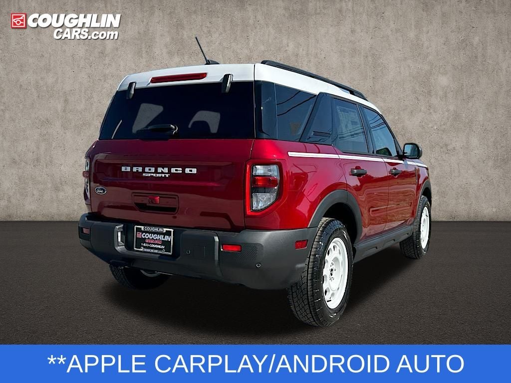Boasting a host of premium features, the Bronco Sport Heritage 4WD is the perfect companion for your next outdoor excursion. Enjoy the convenience of a power moonroof, heated seats, and a rear backup camera, along with the advanced connectivity of navigation, Bluetooth®, and Apple CarPlay/Android Auto. Stay safe on the road with blind spot monitoring and take advantage of the added peace of mind provided by the Bronco Sport's impressive suite of driver-assist technologies.