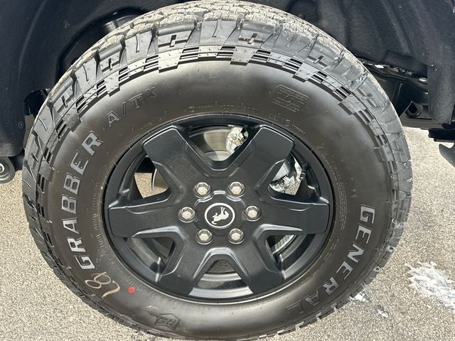 2-Door Intelligent Access w/Lock/Unlock, 4-Wheel Disc Brakes, 7 Speakers, ABS brakes, Air Conditioning, Alloy wheels, AM/FM radio: SiriusXM with 360L, AM/FM Stereo, Ambient Footwell Lighting, Auto High-Beam Headlamps, Auto High-beam Headlights, Auxiliary Switches, Black Diamond Package, BLIS Blind Spot Information System, Brake assist, Carbonized Gray Molded-In-Color Hard Top, Cloth Bucket Seats, Compass, Connected Navigation, Delay-off headlights, Dr & Pass Illuminated Sliding Visor Vanity Mirrors, Driver door bin, Driver vanity mirror, Dual front impact airbags, Dual front side impact airbags, Dual Smart Charging USB Ports, Dual-Zone Electronic Automatic Temperature Control, Electronic Stability Control, Emergency communication system: 911 Assist, Equipment Group 222A Mid Package, Exterior Parking Camera Rear, Front anti-roll bar, Front Bucket Seats, Front Center Armrest, Front reading lights, Front Row Heated Seats, Front wheel independent suspension, Fully automatic headlights, Hard Top Sound Deadening Headliner, Heated door mirrors, Illuminated entry, Integrated roll-over protection, Internet access capable: FordPass Connect, Lane-Keeping System, Leather Shift Knob, LED Fog Lamps, Low tire pressure warning, Occupant sensing airbag, Outside temperature display, Overhead airbag, Overhead console, Panic alarm, Passenger door bin, Passenger vanity mirror, Powder Coated Steel Front & Rear Bumpers, Power door mirrors, Power Outlet - Back Side of Center Floor Console, Power steering, Power windows, Pre-Collision Assist w/Automatic Emergency Braking, Radio data system, Rear Parking Sensors, Rear-View Camera, Rear-Window Defroster & Washer, Remote keyless entry, Rock Rails, Security system, SiriusXM w/360L, Speed control, Split folding rear seat, Steering wheel mounted audio controls, SYNC 4, Tachometer, Telescoping steering wheel, Tilt steering wheel, Traction control, Trip computer, Variably intermittent wipers, Washout Capable Rubberized Flooring, Wheels: 17 Black High Gloss Painted Aluminum, Wheels: 17 Carbonized Gray-Painted Aluminum.