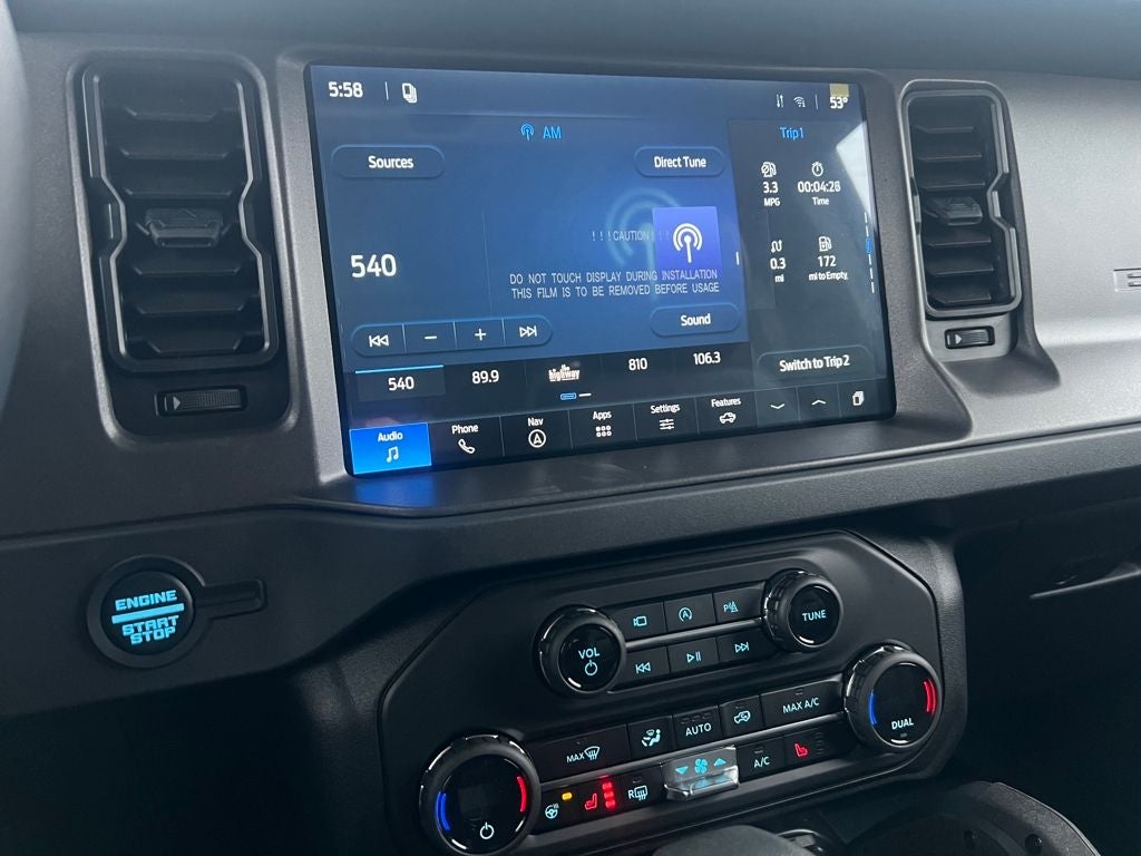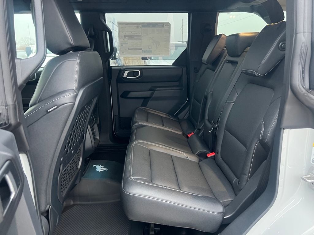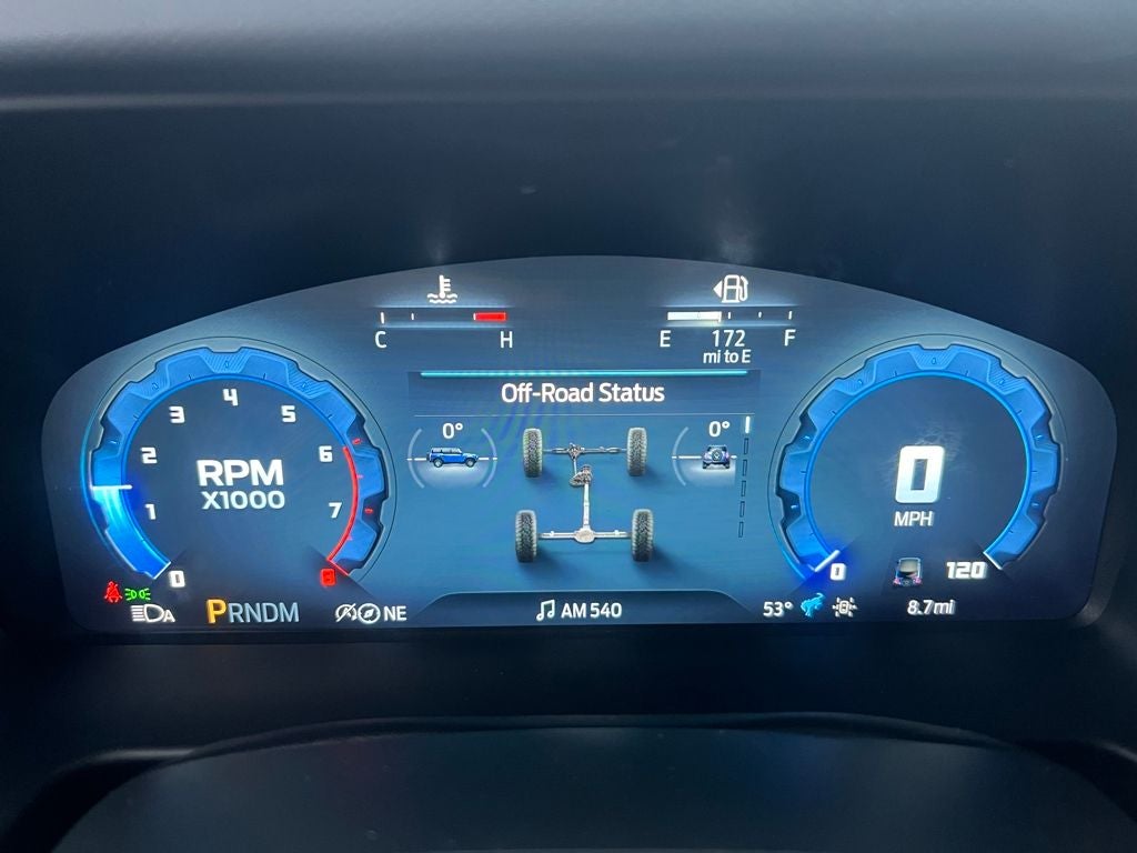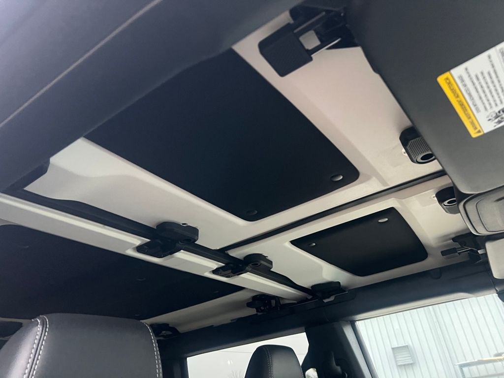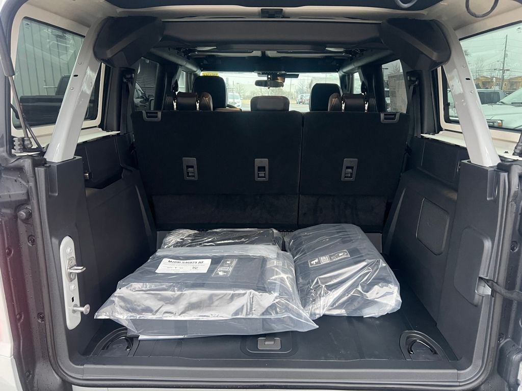 2-Door Intelligent Access with Lock/Unlock, 360-Degree Camera, 4-Wheel Disc Brakes, 4.7 Axle Ratio, 7 Speakers, ABS brakes, Adaptive Cruise Control, Air Conditioning, Alloy wheels, AM/FM radio: SiriusXM with 360L, AM/FM Stereo, Ambient Footwell Lighting, Auto High-Beam Headlamps, Auto High-beam Headlights, Auto-dimming Rear-View mirror, BLIS Blind Spot Information System, Brake assist, Compass, Connected Navigation, Delay-off headlights, Driver and Front Passenger Illuminated Sliding Visor Vanity Mirrors, Driver door bin, Driver vanity mirror, Dual front impact airbags, Dual front side impact airbags, Dual Smart Charging USB Ports, Dual-Zone Electronic Automatic Temperature Control, Electronic Stability Control, Emergency communication system: 911 Assist, Equipment Group 334A Lux Package, Evasive Steering Assist, Exterior Parking Camera Rear, Ford Connectivity Package (1-Year Included), Front and Rear Floor Liners Without Carpet Floor Mats, Front anti-roll bar, Front Bucket Seats, Front Center Armrest, Front fog lights, Front Parking Sensors, Front reading lights, Front Row Heated Seats, Front Row Top Panels and Door Storage Bags, Front wheel independent suspension, Fully automatic headlights, Hard Top Sound Deadening Headliner, Heated door mirrors, Heated front seats, Heated Steering Wheel, Illuminated entry, Information on Demand Panel, Integrated roll-over protection, Lane-Keeping System, Leather Shift Knob, Low tire pressure warning, Marine Grade Vinyl Heated Bucket Seats, Occupant sensing airbag, Outside temperature display, Overhead airbag, Overhead console, Painted Hard Top, Panic alarm, Passenger door bin, Passenger vanity mirror, Power door mirrors, Power steering, Power windows, Pre-Collision Assist with Automatic Emergency Braking, Pro Power Onboard - 400W, Radio data system, Raptor-Style Running Board, Rear Parking Sensors, Rear-View Camera, Rear-Window Defroster and Washer, Remote keyless entry, Security system, Sideview Mirrors, SiriusXM with 360L, Speed control, Split folding rear seat, Steering wheel mounted audio controls, SYNC 4, Tachometer, Telescoping steering wheel, Tilt steering wheel, Traction control, Trip computer, Variably intermittent wipers, Voltmeter, Wheels: 17 Carbonized Gray-Painted Aluminum.
