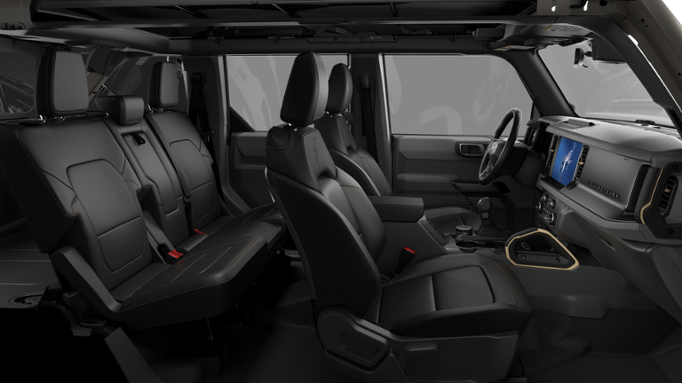 4-Wheel Disc Brakes, 7 Speakers, ABS brakes, Air Conditioning, Alloy wheels, AM/FM radio: SiriusXM with 360L, AM/FM Stereo, Auto High-beam Headlights, Auto-dimming Rear-View mirror, Brake assist, Compass, Delay-off headlights, Driver door bin, Driver vanity mirror, Dual front impact airbags, Dual front side impact airbags, Electronic Stability Control, Emergency communication system: 911 Assist, Exterior Parking Camera Rear, Ford Connectivity Package (1-Year Included), Front anti-roll bar, Front Bucket Seats, Front Center Armrest, Front fog lights, Front reading lights, Front Stabilizer Disconnect, Front wheel independent suspension, Fully automatic headlights, Hard Top Sound Deadening Headliner, Heated door mirrors, Heated front seats, High Clearance Suspension, Illuminated entry, Integrated roll-over protection, Leather Shift Knob, Low tire pressure warning, Marine Grade Vinyl Heated Bucket Seats, Occupant sensing airbag, Outside temperature display, Overhead airbag, Overhead console, Painted Hard Top, Panic alarm, Passenger door bin, Passenger vanity mirror, Position-Sensitive Bilstein Shock Absorbers, Power door mirrors, Power steering, Power windows, Radio data system, Rear-Window Defroster and Washer, Remote keyless entry, Sasquatch Package, Security system, SiriusXM with 360L, Speed control, Split folding rear seat, Steering wheel mounted audio controls, SYNC 4, Tachometer, Telescoping steering wheel, Tilt steering wheel, Traction control, Trip computer, Variably intermittent wipers, Voltmeter, Wheels: 17 Carbonized Gray-Painted Aluminum.