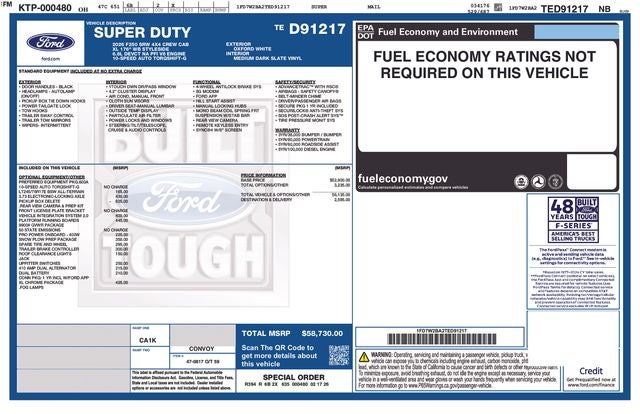 4WD, 17 Argent Painted Steel Wheels, 4-Wheel Disc Brakes, 410 Amp Dual Alternators, 6 Speakers, ABS brakes, Air Conditioning, AM/FM radio, Brake assist, Bright Chrome Hub Covers and Center Ornaments, Chrome Front Bumper, Chrome Rear Step Bumper, Compass, Delay-off headlights, Dual AGM 68 AH Battery, Dual front impact airbags, Dual front side impact airbags, Electronic Stability Control, Emergency communication system: SYNC 4 911 Assist, Exterior Parking Camera Rear, Ford Connectivity Package (1-Year Included), Front anti-roll bar, Front Center Armrest w/Storage, Front License Plate Bracket, Front reading lights, Fully automatic headlights, GVWR: 10,000 Lb Payload Package, Halogen Fog Lamps, HD Vinyl 40/20/40 Split Bench Seat, Heated door mirrors, Illuminated entry, Internet access capable: 5G Modem - Ford Connectivity Package, LED Roof Clearance Lights, Low tire pressure warning, Order Code 600A, Outside temperature display, Overhead airbag, Overhead console, Panic alarm, Passenger vanity mirror, Platform Running Boards, Power door mirrors, Power steering, Power windows, Pro Power Onboard - 400W, Radio: AM/FM Stereo with MP3 Player, Rear reading lights, Rear step bumper, Remote keyless entry, Security system, Snow Plow Prep Package, Speed control, Split folding rear seat, Steering wheel mounted audio controls, SYNC 4, Tachometer, Telescoping steering wheel, Tilt steering wheel, Traction control, Trailer Brake Controller, Trip computer, Turn signal indicator mirrors, Upfitter Switches (6), Variably intermittent wipers, Vehicle Integration System 2.0, XL Chrome Package, 4WD.