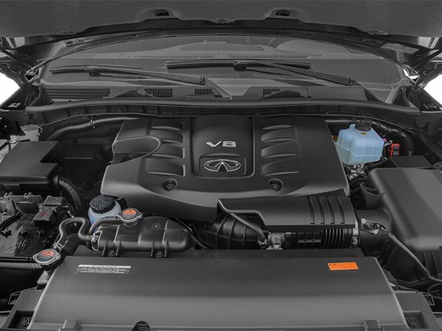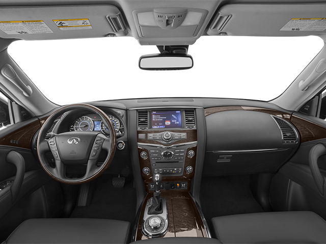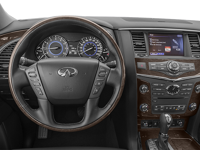 Equipped with 22 Wheel Package (22 x 8.0 9-Spoke Forged Aluminum Alloy Wheels), Theater Package (120V Power Outlet, Dual 7 Color Monitors, Heated 2nd-Row Seats, and Wireless Headphones (2)), 13 Speakers, 2.94 Axle Ratio, 20 7-Spoke Aluminum Alloy Wheels, 3rd row seats: split-bench, 4-Wheel Disc Brakes, ABS brakes, Activation Disclaimer, Air Conditioning, Alloy wheels, AM/FM radio: SiriusXM, Anti-whiplash front head restraints, Auto tilt-away steering wheel, Auto-dimming door mirrors, Auto-dimming Rear-View mirror, Auto-leveling suspension, Automatic temperature control, Bose Premium Sound System, Brake assist, Bumpers: body-color, Carpeted Cargo Mat/Cargo Net & First Aid Kit, CD player, Delay-off headlights, Driver door bin, Driver vanity mirror, Dual front impact airbags, Dual front side impact airbags, Electronic Stability Control, Emergency communication system: INFINITI Connection, Four wheel independent suspension, Front anti-roll bar, Front Bucket Seats, Front Center Armrest, Front dual zone A/C, Front fog lights, Front reading lights, Fully automatic headlights, Garage door transmitter: HomeLink, Genuine wood console insert, Genuine wood dashboard insert, Genuine wood door panel insert, Heated door mirrors, Heated Front Bucket Seats, Heated front seats, Heated steering wheel, High intensity discharge headlights: Bi-Xenon, Illuminated entry, Illuminated Kick Plates, Leather Shift Knob, Leather steering wheel, Leather-Appointed Seat Trim w/Tuscan Burl, Literature Kit, Low tire pressure warning, Memory seat, Navigation System, Occupant sensing airbag, Outside temperature display, Overhead airbag, Overhead console, Panic alarm, Passenger door bin, Passenger vanity mirror, Power door mirrors, Power driver seat, Power Liftgate, Power moonroof, Power passenger seat, Power steering, Power windows, Radio data system, Rain sensing wipers, Rear air conditioning, Rear anti-roll bar, Rear audio controls, Rear reading lights, Rear seat center armrest, Rear window defroster, Rear window wiper, Reclining 3rd row seat, Remote keyless entry, Roof rack: rails only, Roof Rail Crossbars, Security system, Speed control, Speed-sensing steering, Split folding rear seat, Spoiler, Stainless Steel Rear Bumper Protector, Steering wheel memory, Steering wheel mounted audio controls, Tachometer, Telescoping steering wheel, Tilt steering wheel, Traction control, Trip computer, Turn signal indicator mirrors, Variably intermittent wipers, and Voltmeter.