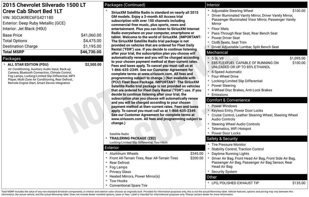 Recent Arrival! Please call for more information. If you don't see the car of your dreams in our huge inventory, chances are we can get it for you! 10-Way Power Driver's Seat Adjuster, 110-Volt AC Power Outlet, 150 Amp Alternator, 3.42 Rear Axle Ratio, 4-Wheel Disc Brakes, 4.2 Diagonal Color Display Driver Info Center, 40/20/40 Front Split Bench Seat, 6 Speaker Audio System, 6 Speakers, ABS brakes, Air Conditioning, All Star Edition, Alloy wheels, AM/FM radio: SiriusXM, Auxiliary External Transmission Oil Cooler, Bluetooth® For Phone, Body Color Bodyside Moldings, Body Color Door Handles, Body-Color Mirror Caps, Body-Color Power Adjustable Heated Outside Mirrors, Bodyside moldings, Brake assist, Bumpers: chrome, CD player, Cloth Seat Trim, Color-Keyed Carpeting w/Rubberized Vinyl Floor Mats, Compass, Deep-Tinted Glass, Delay-off headlights, Driver & Front Passenger Illuminated Vanity Mirrors, Driver door bin, Driver vanity mirror, Dual front impact airbags, Dual front side impact airbags, Dual-Zone Automatic Climate Control, E85 FlexFuel Capable, Electric Rear-Window Defogger, Electronic Stability Control, Emergency communication system: OnStar Directions & Connections, EZ Lift & Lower Tailgate, Front anti-roll bar, Front Center Armrest w/Storage, Front Chrome Bumper, Front Halogen Fog Lamps, Front License Plate Kit, Front reading lights, Front wheel independent suspension, Fully automatic headlights, Heated door mirrors, Heavy-Duty Rear Locking Differential, Illuminated entry, Leather Wrapped Steering Wheel w/Cruise Controls, Low tire pressure warning, Manual Tilt Wheel Steering Column, Manual Tilt/Telescoping Steering Column, Occupant sensing airbag, OnStar 6 Months Directions & Connections Plan, OnStar w/4G LTE, Outside temperature display, Overhead airbag, Overhead console, Panic alarm, Passenger door bin, Passenger vanity mirror, Polished Exhaust Tip, Power door mirrors, Power steering, Power windows, Power Windows w/Driver Express Up, Premium audio system: Chevrolet MyLink, Radio data system, Radio: AM/FM 8 Diagonal Color Touch Screen, Radio: AM/FM Audio System w/Chevrolet MyLink, Rear 60/40 Folding Bench Seat (Folds Up), Rear Chrome Bumper, Rear reading lights, Rear seat center armrest, Rear step bumper, Rear Vision Camera w/Dynamic Guide Lines, Rear Wheelhouse Liners, Remote Keyless Entry, Remote keyless entry, Remote Vehicle Starter System, Single Slot CD/MP3 Player, SiriusXM Satellite Radio, Speed control, Speed-sensing steering, Split folding rear seat, Steering Wheel Audio Controls, Steering wheel mounted audio controls, Tachometer, Theft Deterrent System (Unauthorized Entry), Tilt steering wheel, Traction control, Trailering Equipment, Trip computer, Variably intermittent wipers, Voltmeter, Wheels: 17 x 8 Bright Machined Aluminum.All rebates to dealer. All prior sales excluded. In stock units only. 0% offers may be in lieu of factory rebates, and are based on approved tier 1 credit through GM Financial. Leases include 10K miles per year with $0.25 per mile over penalty. Purchase Payment based on tier credit through preferred lender. Lease Payment based on approved tier 1 credit through GM Financial. Payment includes title, registration and bank fees. Payment excludes tax and document fee. Price excludes tax, title, registration and document fee. No security deposit required. $395 disposition fee for GM Financial. Residency restrictions may apply. While we make every effort to prevent pricing errors, key stroke and human errors do occur. Please contact dealer for details.