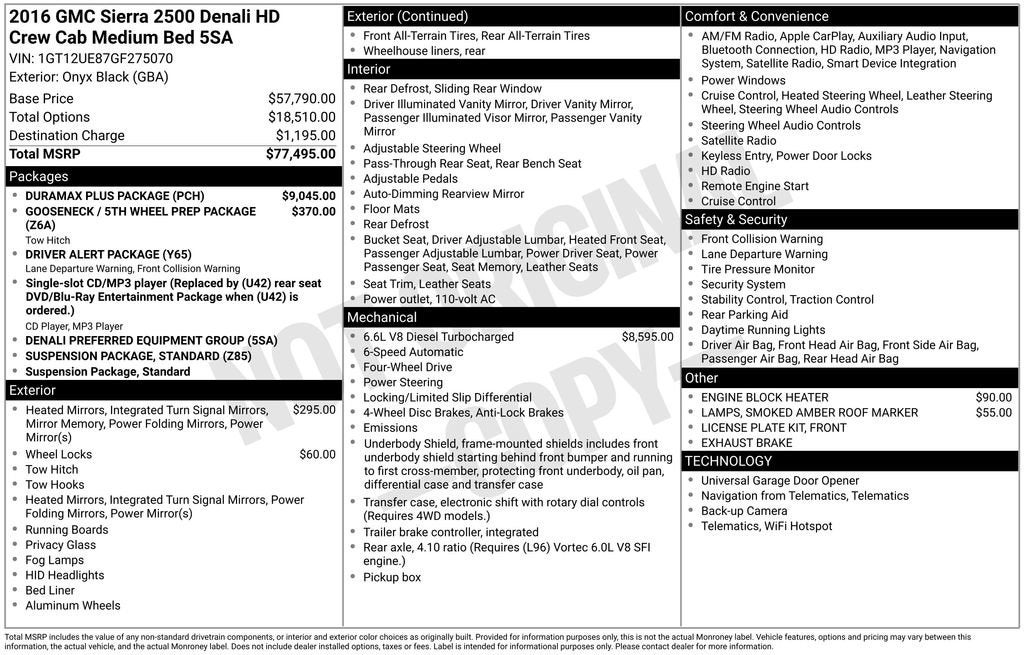 Introducing the 2016 GMC Sierra 2500HD Denali - a powerhouse of capability and sophistication. This exceptional truck is equipped with a Duramax 6.6L V8 Turbodiesel engine, paired with an Allison 1000 6-Speed Automatic transmission and 4-wheel drive, delivering unparalleled performance and towing capacity.