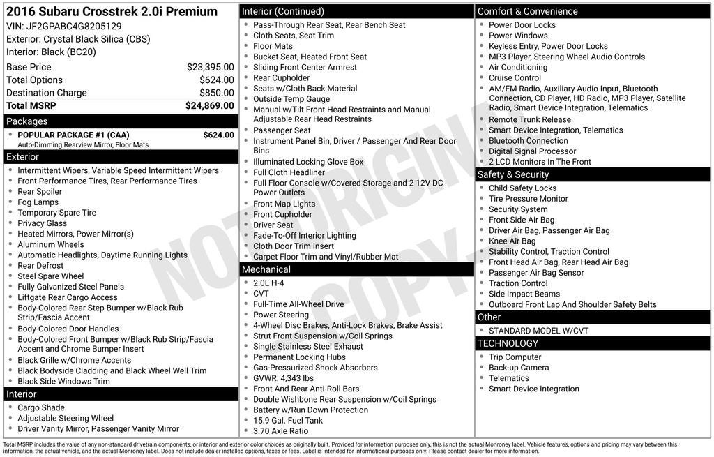 At Coughlin Chevrolet, Buick, GMC in Chillicothe we offer all our pre-owned inventory at market based pricing to insure a no haggle experience and a fair price right up front.17 x 7.0J Aluminum Alloy Wheels, 3.70 Axle Ratio, 4-Wheel Disc Brakes, 6 Speakers, ABS brakes, Air Conditioning, All Weather Floor Mats, Alloy wheels, AM/FM radio, Auto-Dimming Mirror w/Compass, Brake assist, Bumpers: body-color, CD player, Cloth Upholstery, Driver door bin, Driver vanity mirror, Dual front impact airbags, Dual front side impact airbags, Electronic Stability Control, Emergency communication system: STARLINK, Exterior Parking Camera Rear, Four wheel independent suspension, Front anti-roll bar, Front Bucket Seats, Front Center Armrest, Front fog lights, Front reading lights, Heated door mirrors, Heated Front Bucket Seats, Heated front seats, Illuminated entry, Knee airbag, Low tire pressure warning, Occupant sensing airbag, Outside temperature display, Overhead airbag, Panic alarm, Passenger door bin, Passenger vanity mirror, Popular Package #1, Power door mirrors, Power steering, Power windows, Radio data system, Radio: Subaru Starlink 6.2 Multimedia System, Radio: Subaru Starlink 7.0 Multimedia Plus System, Rear anti-roll bar, Rear Bumper Cover, Rear Seat Back Protector, Rear Vision Camera, Rear window defroster, Rear window wiper, Remote keyless entry, Roof rack: rails only, Security system, Speed control, Speed-sensing steering, Splash Guards, Split folding rear seat, Spoiler, Standard Model w/CVT, Steering wheel mounted audio controls, Subaru Starlink Smartphone Integration, Tachometer, Telescoping steering wheel, Tilt steering wheel, Traction control, Trip computer, Variably intermittent wipers. 2016 Subaru Crosstrek CARFAX One-Owner. Clean CARFAX.We carry all makes and models and have vehicles in all different colors. Our Pre-owned Vehicles could have some of the following features listed: Alloy wheels, aluminum wheels, backup camera, Bluetooth®, cargo package, chrome wheels, convenience package, leather seats, navigation system, power package, remote start, se package, safety package, sunroof/moonroof, tow package, adaptive cruise control, comfort package, tow package, trailer package, appearance package, cargo package, power package, safety package, acoustical package, dvd entertainment system, preferred package, technology package, driver confidence package, audio package, heat package, memory package, off road package, premium package, premium sound package, remote vehicle starter prep package, skid plate package, solid smooth ride suspension package, sound package, sport package, steel wheels, suspension package, z71 package, 3rd row seat, Bluetooth®, hands-free, cd player, cruise control, dvd player. Keyless entry, lift kit, multi-zone climate control, navigation, portable audio connection, power locks, power windows, premium audio, security system, steering wheel controls, sunroof, trailer hitch, apple carplay/android auto, brake assist, homelink, memory seat, stability control, android auto, apple carplay.