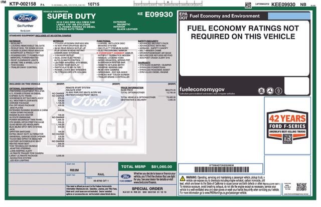 4WD, 6 Angular Chrome Step Bars, Adaptive Steering, Ambient Lighting - Fixed Color, Automatic High Beam, Body-Color Door Handles w/Chrome Insert, Chrome Exhaust Tip, Chrome Package, Easy Entry®/Exit Memory Driver's Seat Feature, GVWR: 14,000 lb Payload Package, Intelligent Access w/Push-Button Start, Lane-Keeping Alert, Lariat Ultimate Package, LED Box Lighting, Memory Power-Adjustable Pedals, Navigation System, Order Code 678A, Power Heated/Cooled Driver Seat w/Memory, Power Heated/Cooled Passenger Seat, Power Telescoping/Tilt Steering Wheel/Column, PowerScope Trailer Tow Mirrors w/Memory, Rear CHMSL Camera, Remote Start System, Remote Tailgate Release, Tailgate Step & Handle, Tow Technology Bundle, Ultimate Trailer Tow Camera System, Unique Chrome Mirror Caps, Voice-Activated Navigation, 110V/400W Outlet, 19.5 Forged Polished Aluminum Wheels, 4-Wheel Disc Brakes, ABS brakes, Air Conditioning, Alloy wheels, AM/FM radio, Brake assist, Delay-off headlights, Dual front impact airbags, Dual front side impact airbags, Dual rear wheels, Electronic Stability Control, Exterior Parking Camera Rear, Front anti-roll bar, Front reading lights, Fully automatic headlights, Limited Slip w/4.30 Axle Ratio, Outside temperature display, Overhead airbag, Overhead console, Passenger vanity mirror, Power steering, Rear anti-roll bar, Rear reading lights, Rear step bumper, SiriusXM Radio, Split folding rear seat, SYNC 3 Communications & Entertainment System, Tachometer, Telescoping steering wheel, Tilt steering wheel, Tough Bed Spray-In Bedliner, Traction control, Trip computer, Variably intermittent wipers, NAVIGATION/GPS, 4WD/AWD/4X4, REAR BACKUP CAMERA, TRAILER TOW BACK UP CAMERA, 4WD, 6 Angular Chrome Step Bars, Adaptive Steering, Ambient Lighting - Fixed Color, Automatic High Beam, Body-Color Door Handles w/Chrome Insert, Chrome Exhaust Tip, Chrome Package, Easy Entry®/Exit Memory Driver's Seat Feature, GVWR: 14,000 lb Payload Package, Intelligent Access w/Push-Button Start, Lane-Keeping Alert, Lariat Ultimate Package, LED Box Lighting, Memory Power-Adjustable Pedals, Navigation System, Order Code 678A, Power Heated/Cooled Driver Seat w/Memory, Power Heated/Cooled Passenger Seat, Power Telescoping/Tilt Steering Wheel/Column, PowerScope Trailer Tow Mirrors w/Memory, Rear CHMSL Camera, Remote Start System, Remote Tailgate Release, Tailgate Step & Handle, Tow Technology Bundle, Ultimate Trailer Tow Camera System, Unique Chrome Mirror Caps, Voice-Activated Navigation.