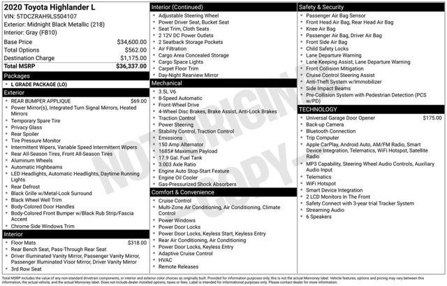 Midnight Black Metallic 2020 Toyota Highlander L 21/29 City/Highway MPG
