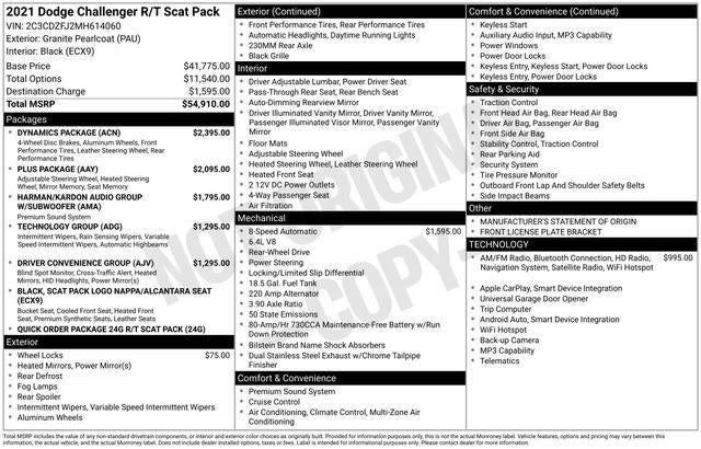 CONTACT COUGHLIN TOYOTA SALES AT 740-929-9000. Priced below KBB Fair Purchase Price! Clean CARFAX. ***This 2021 Dodge Challenger R/T Scat Pack is a great choice***, Challenger R/T Scat Pack, 2D Coupe, SRT HEMI 6.4L V8 MDS, 8-Speed Automatic, RWD, Granite Crystal Metallic Clearcoat. Please call or e-mail first for the best and quickest information. Visit www.coughlintoyota.com to see more of this store’s new and used vehicle inventory for sale. Pricing excludes tax, title, license and document fee. While we make every effort to prevent pricing errors, key stroke and human errors do occur. Please see dealer for details. Odometer is 10712 miles below market average!