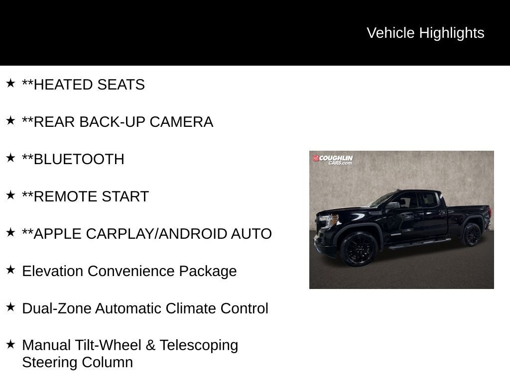 **HEATED SEATS, **REAR BACK-UP CAMERA, **Bluetooth®, **REMOTE START, **APPLE CARPLAY/ANDROID AUTO, 8-Speed Automatic, 4WD, Black Cloth, Apple CarPlay/Android Auto, Dual-Zone Automatic Climate Control, Elevation Convenience Package, Heated Driver & Front Outboard Passenger Seating, Heated Steering Wheel, Manual Tilt-Wheel & Telescoping Steering Column, Rear Wheelhouse Liners, Wheels: 20 x 9 Black Gloss Painted Aluminum, 10-Way Power Driver Seat Adjuster w/Lumbar, 12-Volt Rear Auxiliary Power Outlet, 220 Amp Alternator, 3.42 Rear Axle Ratio, 4-Way Manual Passenger Seat Adjuster, 4-Wheel Disc Brakes, 4G LTE Wi-Fi Hotspot Capable, 6 Speakers, 6-Speaker Audio System Feature, ABS brakes, Air Conditioning, Alloy wheels, AM/FM radio: SiriusXM, Auto-Locking Rear Differential, Automatic temperature control, Body-Color Surround Grille, Brake assist, Bumpers: body-color, Cloth Seat Trim, Color-Keyed Carpeting Floor Covering, Compass, Deep-Tinted Glass, Delay-off headlights, Driver door bin, Driver vanity mirror, Dual front impact airbags, Dual front side impact airbags, Electric Rear-Window Defogger, Electrical Lock Control Steering Column, Electronic Stability Control, Elevation Value Package, Front 40/20/40 Split-Bench Seat, Front anti-roll bar, Front Center Armrest w/Storage, Front dual zone A/C, Front fog lights, Front Frame-Mounted Black Recovery Hooks, Front License Plate Kit, Front reading lights, Front Rubberized-Vinyl Floor Mats, Front wheel independent suspension, Fully automatic headlights, GMC Connected Access Capable, Heated door mirrors, Heated front seats, Heated steering wheel, Heavy Duty Suspension, Hitch Guidance, Illuminated entry, Keyless Open & Start, LED Cargo Area Lighting, Low tire pressure warning, Occupant sensing airbag, OnStar & GMC Connected Services Capable, Outside temperature display, Overhead airbag, Overhead console, Panic alarm, Passenger door bin, Passenger vanity mirror, Power Door Locks, Power door mirrors, Power driver seat, Power Front Windows w/Driver Express Up/Down, Power Front Windows w/Passenger Express Down, Power Rear Windows w/Express Down, Power steering, Power windows, Premium audio system: GMC Infotainment System, Radio data system, Radio: GMC Infotainment Audio System, Rear Dual USB Charging-Only Ports, Rear reading lights, Rear Rubberized-Vinyl Floor Mats, Rear step bumper, Rear window defroster, Remote keyless entry, Remote Vehicle Starter System, Security system, SiriusXM Radio, Speed control, Speed-sensing steering, Split folding rear seat, Steering Wheel Audio Controls, Steering wheel mounted audio controls, Tachometer, Telescoping steering wheel, Theft Deterrent System (Unauthorized Entry), Tilt steering wheel, Traction control, Trailering Package, Trip computer, Variably intermittent wipers, Voltmeter, 8-Speed Automatic, 4WD, Black Cloth, Apple CarPlay/Android Auto, Dual-Zone Automatic Climate Control, Elevation Convenience Package, Heated Driver & Front Outboard Passenger Seating, Heated Steering Wheel, Manual Tilt-Wheel & Telescoping Steering Column, Rear Wheelhouse Liners, Wheels: 20 x 9 Black Gloss Painted Aluminum.