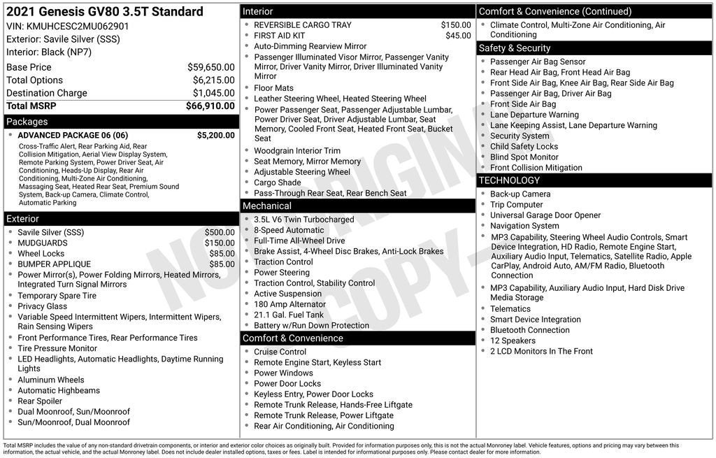 Savile Silver 2021 Genesis GV80 3.5T Odometer is 3639 miles below market average!