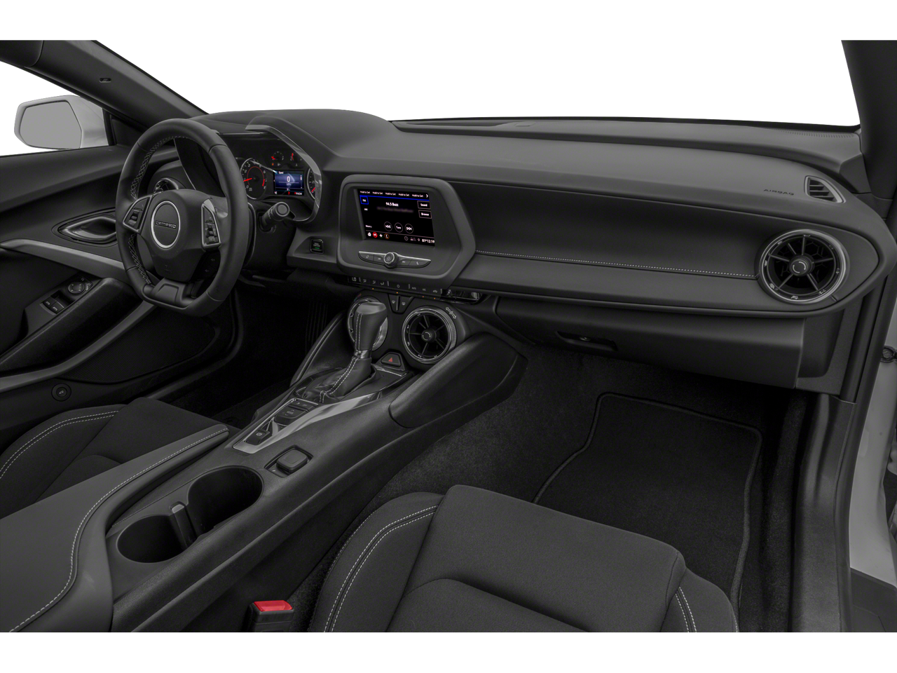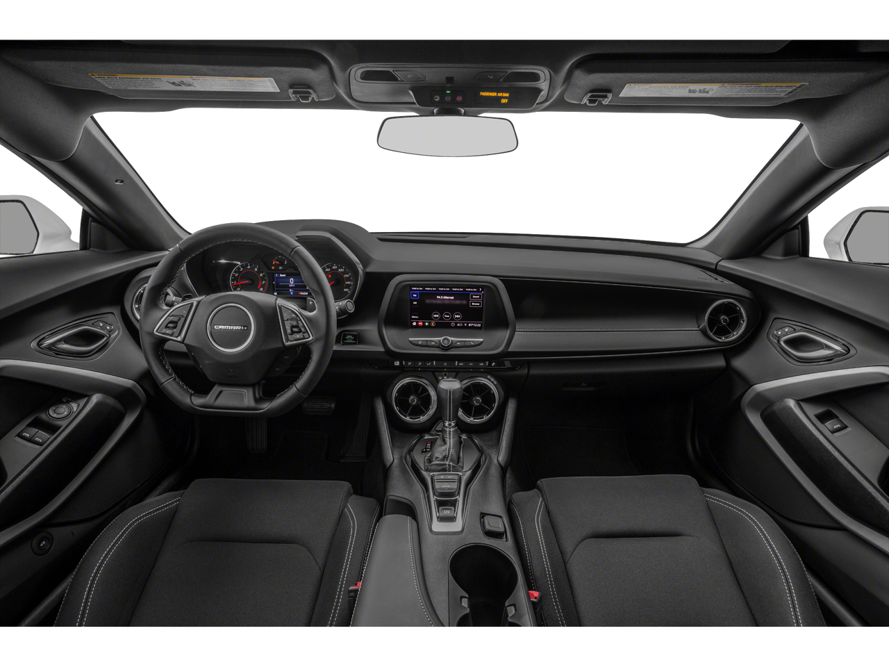 4-Wheel Disc Brakes, 6 Speakers, 6-Speaker Audio System Feature, 8-Way Power Driver Seat Adjuster, ABS brakes, Air Conditioning, Alloy wheels, Apple CarPlay/Android Auto, Automatic temperature control, Bluetooth® For Phone, Brake assist, Bumpers: body-color, Cloth Seat Trim, Compass, Decklid-Mounted Lip Spoiler, Delay-off headlights, Driver door bin, Driver vanity mirror, Dual front impact airbags, Dual front side impact airbags, Electronic Stability Control, Exterior Parking Camera Rear, Four wheel independent suspension, Front anti-roll bar, Front Bucket Seats, Front Center Armrest, Front reading lights, Front Sport Bucket Seats, Fully automatic headlights, Illuminated entry, Knee airbag, Leather Shift Knob, Low tire pressure warning, Occupant sensing airbag, Overhead airbag, Paddle-Shift Manual Controls, Panic alarm, Passenger door bin, Passenger vanity mirror, Power door mirrors, Power driver seat, Power passenger seat, Power steering, Power windows, Premium audio system: Chevrolet Infotainment System, Radio data system, Radio: Chevrolet Infotainment 3 System, Rear anti-roll bar, Rear window defroster, Remote keyless entry, Remote Vehicle Starter System, Satin Black Appearance Package, Security system, Speed control, Speed-sensing steering, Steering wheel mounted audio controls, Tachometer, Telescoping steering wheel, Tilt steering wheel, Tire Inflation Kit, Traction control, Trip computer, Variably intermittent wipers, Voltmeter. 2022 Chevrolet Camaro Clean CARFAX.