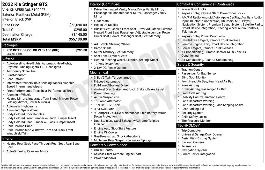 Equipped with Red Interior Color Package, Kia Certified Pre-Owned Certified, 15 Speakers, 4-Wheel Disc Brakes, ABS brakes, Adaptive suspension, Air Conditioning, Alloy wheels, AM/FM radio: SiriusXM, Anti-whiplash front head restraints, Apple CarPlay & Android Auto, Auto High-beam Headlights, Auto tilt-away steering wheel, Auto-dimming door mirrors, Auto-dimming Rear-View mirror, Automatic temperature control, Brake assist, Bumpers: body-color, Compass, Delay-off headlights, Driver door bin, Driver vanity mirror, Dual front impact airbags, Dual front side impact airbags, Electronic Stability Control, Emergency communication system: UVO eServices, Four wheel independent suspension, Front anti-roll bar, Front Bucket Seats, Front Center Armrest, Front dual zone A/C, Front reading lights, Fully automatic headlights, Garage door transmitter: HomeLink, harman/kardon® Speakers, Heads-Up Display, Heated & Ventilated Front Bucket Seats, Heated door mirrors, Heated front seats, Heated rear seats, Heated steering wheel, Illuminated entry, Knee airbag, Low tire pressure warning, Memory seat, Nappa Leather Seat Trim, Navigation System, Occupant sensing airbag, Outside temperature display, Overhead airbag, Overhead console, Panic alarm, Passenger door bin, Passenger vanity mirror, Power door mirrors, Power driver seat, Power Liftgate, Power moonroof, Power passenger seat, Power steering, Power windows, Radio: harmon/kardon AM/FM/HD Audio System, Rain sensing wipers, Rear air conditioning, Rear anti-roll bar, Rear reading lights, Rear seat center armrest, Rear window defroster, Remote keyless entry, Security system, Smart Key w/ Push Button and Remote Start, Speed control, Speed-sensing steering, Speed-Sensitive Wipers, Split folding rear seat, Sport steering wheel, Steering wheel memory, Steering wheel mounted audio controls, Tachometer, Telescoping steering wheel, Tilt steering wheel, Traction control, Trip computer, Turn signal indicator mirrors, Variably intermittent wipers, Ventilated front seats, and Wheels: 8.0J x 19 Front/8.5J x 19 Rear Alloy.