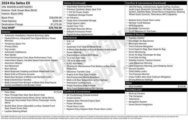- - - THIS 2024 KIA SELTOS EX ALL WHEEL DRIVE IS A ONE OWNER LOCAL TRADE WITH A PERFECT HISTORY REPORT AND THE REMAINDER OF THE 5 YEAR 60,000 MILE FACTORY WARRANTY.....THIS IS A GREAT LOADED ALL WHEEL DRIVE SUV THAT IS RATED AT 31 MILES PER GALLON !!!
