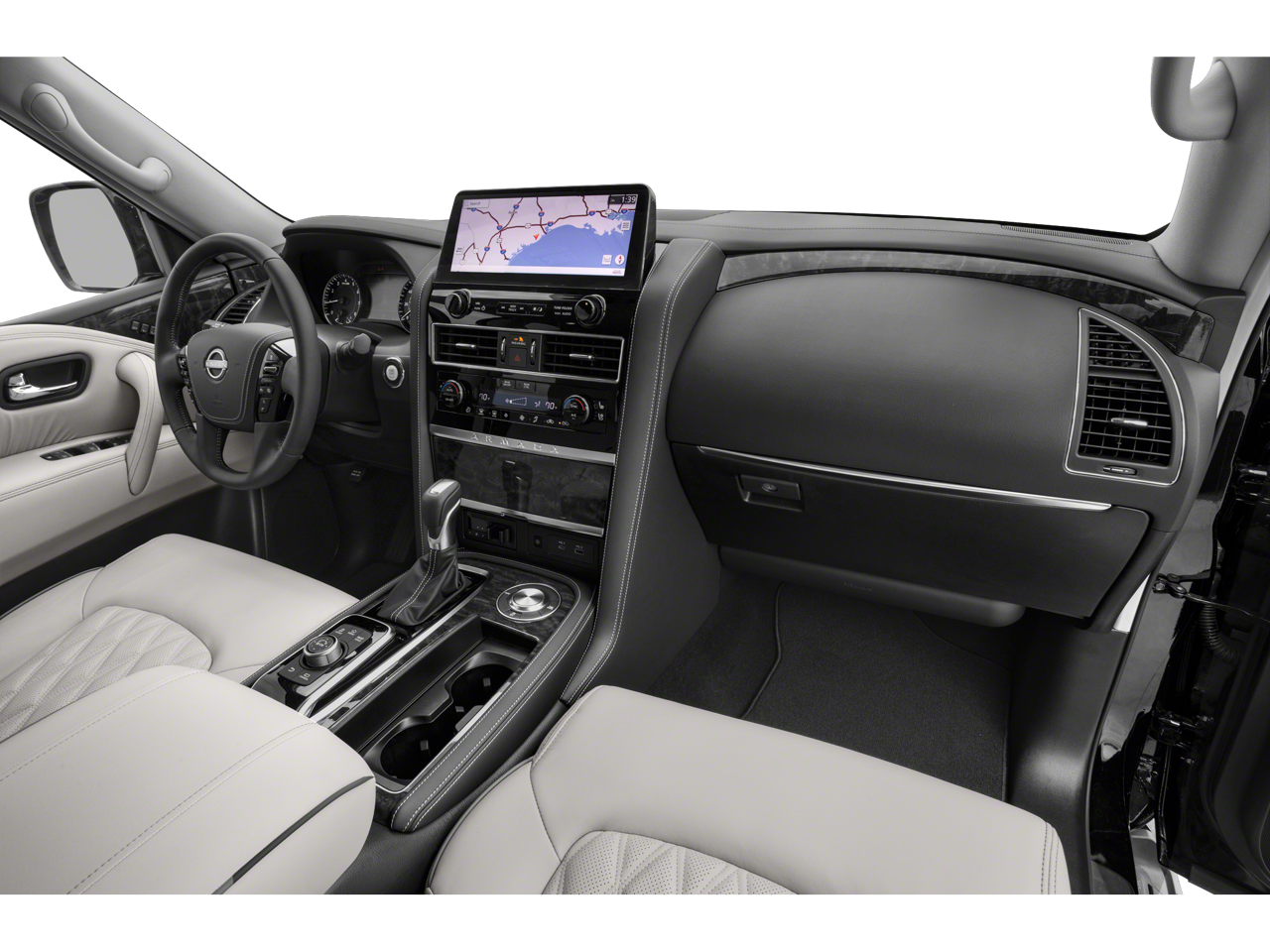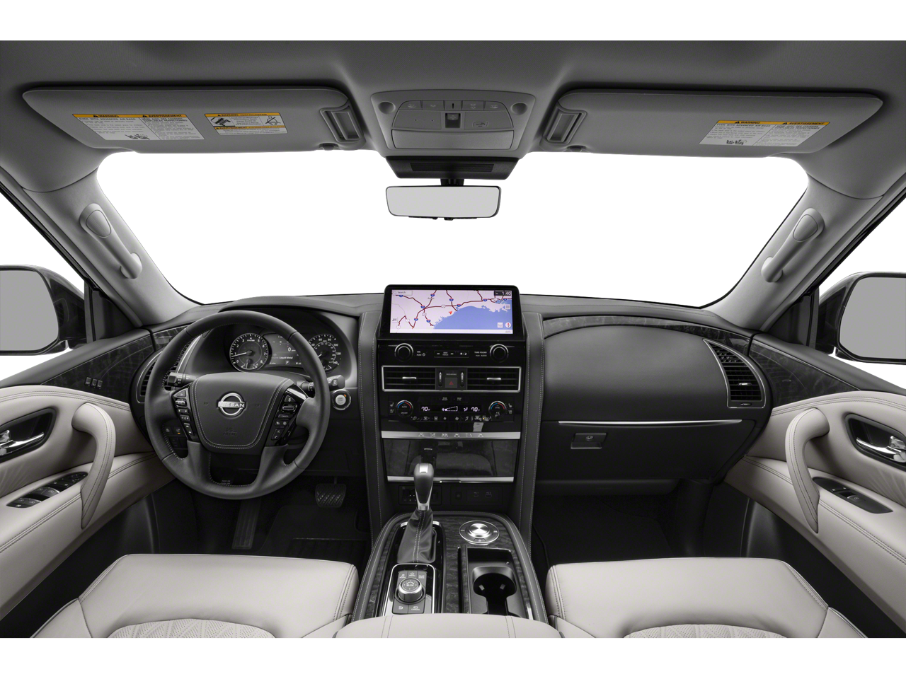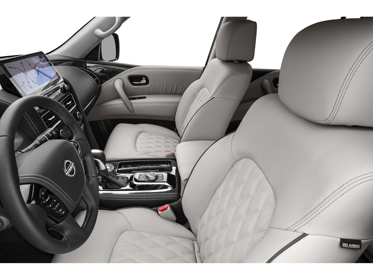 Equipped with Captain's Chairs Package (2nd Row Captain's Chairs and 2nd Row Center Console w/Padded Armrest), Cargo Package, 13 Speakers, 2.937 Axle Ratio, 3rd Row Carpeted Floor Mats - Captain Seat, 3rd row seats: split-bench, 4-Wheel Disc Brakes, ABS brakes, Air Conditioning, Alloy wheels, AM/FM radio: SiriusXM, Anti-whiplash front head restraints, Auto High-beam Headlights, Auto tilt-away steering wheel, Auto-dimming door mirrors, Auto-dimming Rear-View mirror, Auto-leveling suspension, Automatic temperature control, Brake assist, Bumpers: body-color, Climate-Controlled Front Bucket Seats, Delay-off headlights, Driver door bin, Driver vanity mirror, Dual front impact airbags, Dual front side impact airbags, Electronic Stability Control, Emergency communication system: NissanConnect Services, Exterior Parking Camera Rear, Four wheel independent suspension, Front anti-roll bar, Front Bucket Seats, Front Center Armrest, Front dual zone A/C, Front fog lights, Front reading lights, Fully automatic headlights, Garage door transmitter: HomeLink, Heated door mirrors, Heated front seats, Heated rear seats, Heated steering wheel, HVAC memory, Illuminated entry, Illuminated Kick Plates, Illuminated Scuff Plate, Knee airbag, Leather Shift Knob, Leather steering wheel, Low tire pressure warning, Memory seat, Navigation System, Occupant sensing airbag, Outside temperature display, Overhead airbag, Overhead console, Panic alarm, Passenger door bin, Passenger vanity mirror, Power door mirrors, Power driver seat, Power Liftgate, Power moonroof, Power passenger seat, Power steering, Power windows, Quilted Leather Seat Trim, Radio: NissanConnect w/SiriusXM, Rain sensing wipers, Rear air conditioning, Rear anti-roll bar, Rear reading lights, Rear seat center armrest, Rear window defroster, Rear window wiper, Reclining 3rd row seat, Remote keyless entry, Roof Rail Cross Bars - Gun Metal, Security system, Speed control, Speed-sensing steering, Speed-Sensitive Wipers, Split folding rear seat, Spoiler, Steering wheel memory, Steering wheel mounted audio controls, Tachometer, Telescoping steering wheel, Tilt steering wheel, Traction control, Trip computer, Turn signal indicator mirrors, Variably intermittent wipers, Ventilated front seats, Voltmeter, and Wheels: 22 x 8J Machine-Faced w/Tinted Clear Coat.