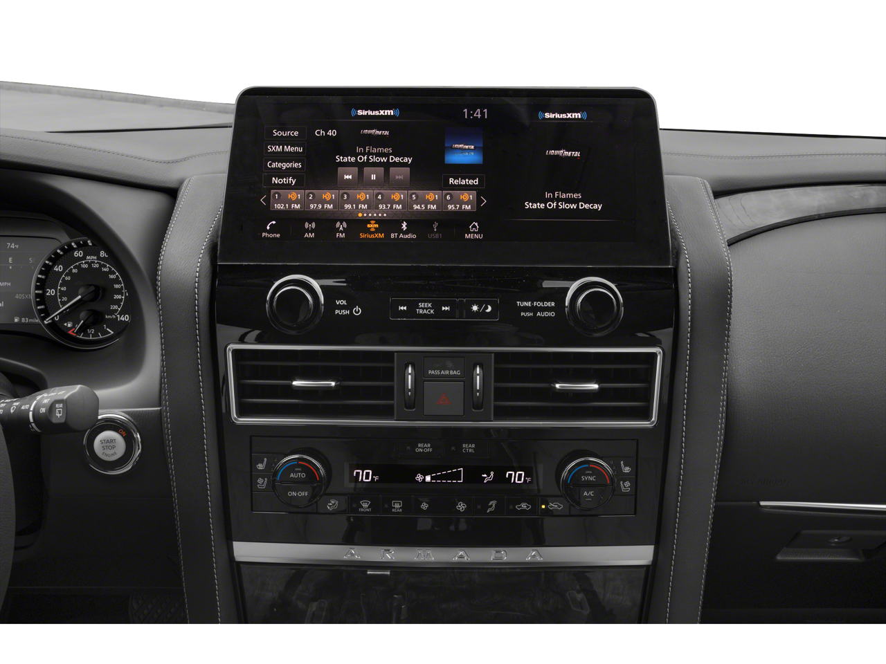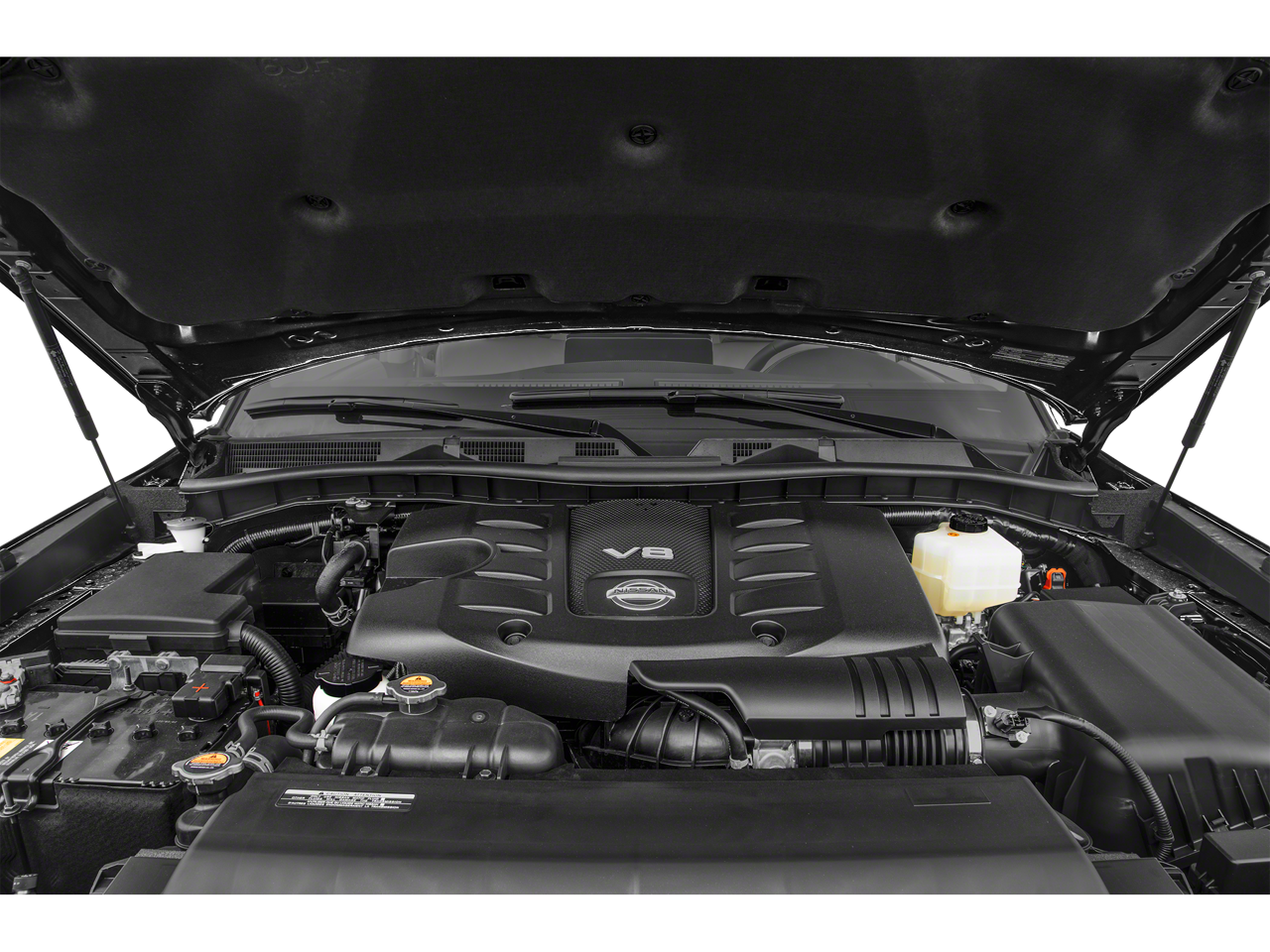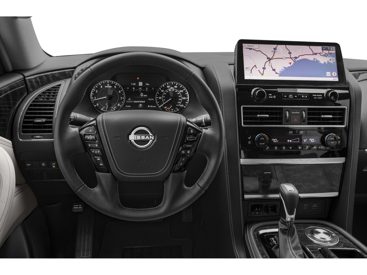 Equipped with Captain's Chairs Package (2nd Row Captain's Chairs and 2nd Row Center Console w/Padded Armrest), Cargo Package, 13 Speakers, 2.937 Axle Ratio, 3rd Row Carpeted Floor Mats - Captain Seat, 3rd row seats: split-bench, 4-Wheel Disc Brakes, ABS brakes, Air Conditioning, Alloy wheels, AM/FM radio: SiriusXM, Anti-whiplash front head restraints, Auto High-beam Headlights, Auto tilt-away steering wheel, Auto-dimming door mirrors, Auto-dimming Rear-View mirror, Auto-leveling suspension, Automatic temperature control, Brake assist, Bumpers: body-color, Climate-Controlled Front Bucket Seats, Delay-off headlights, Driver door bin, Driver vanity mirror, Dual front impact airbags, Dual front side impact airbags, Electronic Stability Control, Emergency communication system: NissanConnect Services, Exterior Parking Camera Rear, Four wheel independent suspension, Front anti-roll bar, Front Bucket Seats, Front Center Armrest, Front dual zone A/C, Front fog lights, Front reading lights, Fully automatic headlights, Garage door transmitter: HomeLink, Heated door mirrors, Heated front seats, Heated rear seats, Heated steering wheel, HVAC memory, Illuminated entry, Illuminated Kick Plates, Illuminated Scuff Plate, Knee airbag, Leather Shift Knob, Leather steering wheel, Low tire pressure warning, Memory seat, Navigation System, Occupant sensing airbag, Outside temperature display, Overhead airbag, Overhead console, Panic alarm, Passenger door bin, Passenger vanity mirror, Power door mirrors, Power driver seat, Power Liftgate, Power moonroof, Power passenger seat, Power steering, Power windows, Quilted Leather Seat Trim, Radio: NissanConnect w/SiriusXM, Rain sensing wipers, Rear air conditioning, Rear anti-roll bar, Rear reading lights, Rear seat center armrest, Rear window defroster, Rear window wiper, Reclining 3rd row seat, Remote keyless entry, Roof Rail Cross Bars - Gun Metal, Security system, Speed control, Speed-sensing steering, Speed-Sensitive Wipers, Split folding rear seat, Spoiler, Steering wheel memory, Steering wheel mounted audio controls, Tachometer, Telescoping steering wheel, Tilt steering wheel, Traction control, Trip computer, Turn signal indicator mirrors, Variably intermittent wipers, Ventilated front seats, Voltmeter, and Wheels: 22 x 8J Machine-Faced w/Tinted Clear Coat.